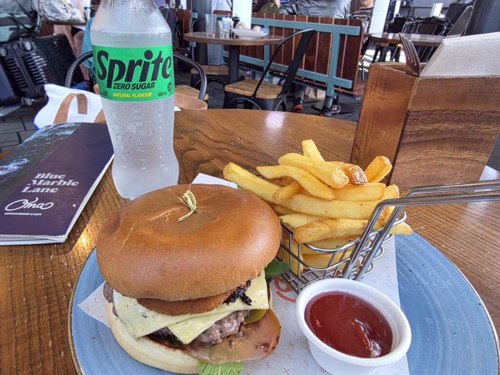 First stop was the airport and we used our priority pass to grab a burger to share – and Tim got a cocktail.  We headed to the Air NZ lounge for a quick stop before heading to the plane.