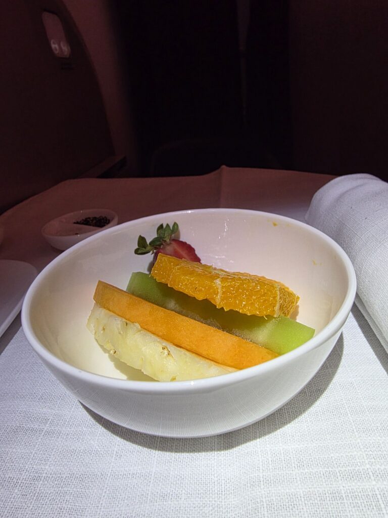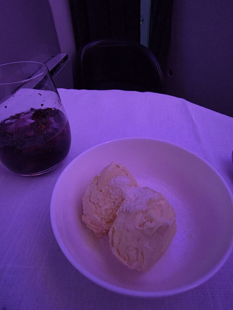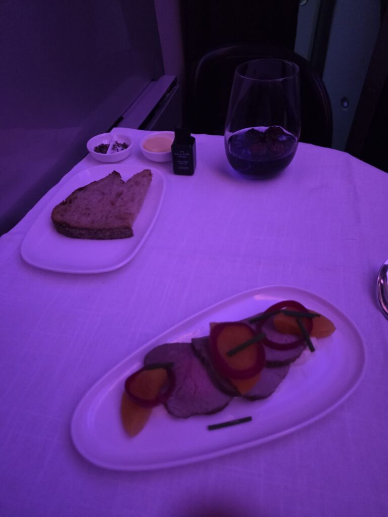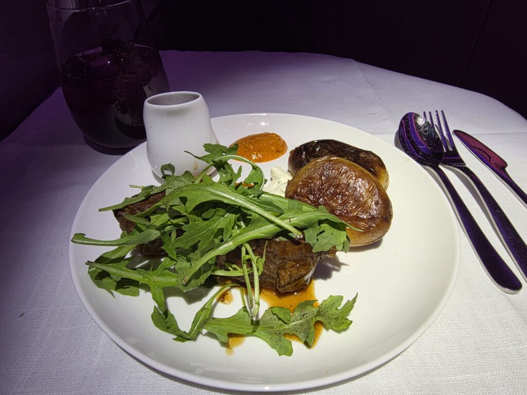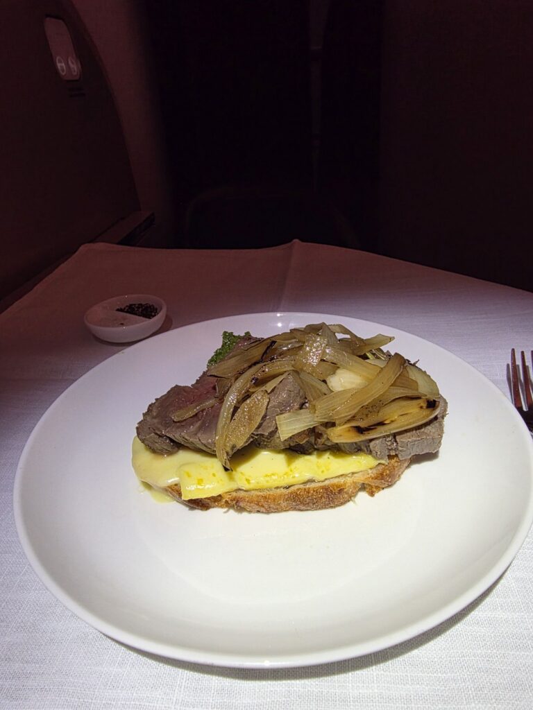 We both had the beef shortrib for dinner, which came with duck fat potatoes and a delicious side salad.  12 hours later after a relaxing sleep brunch was served before landing and we had the open steak sandwich – absolutely delicious!