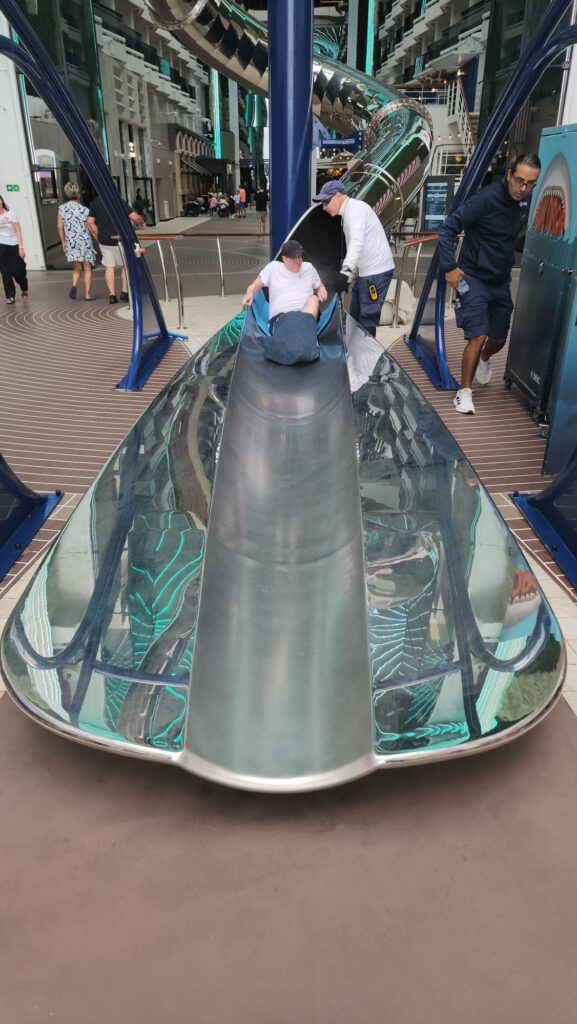 Right after that, we headed to our booking for the Jawdrop slide, the dry slide that shoots you from deck 20 all the way down to deck 8. It was so much fun. It was similar to the ArcelorMittal Orbit slide we did in London years ago.